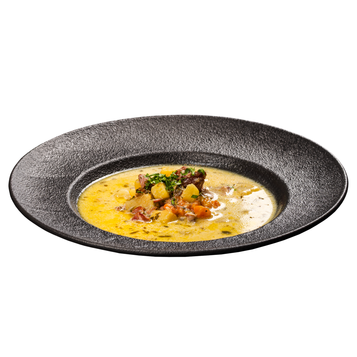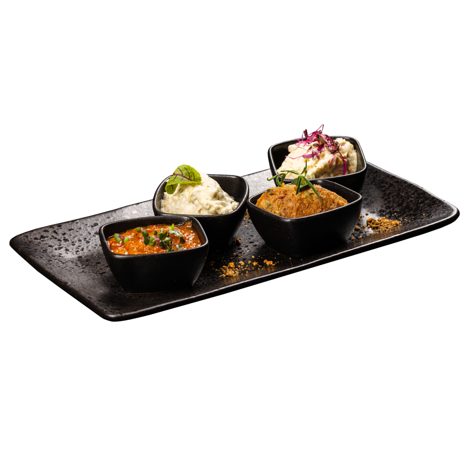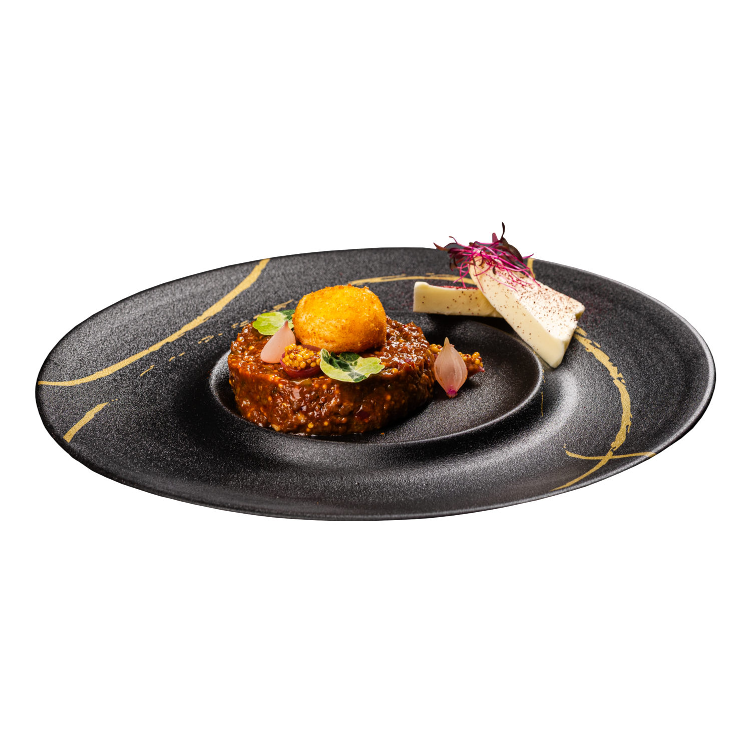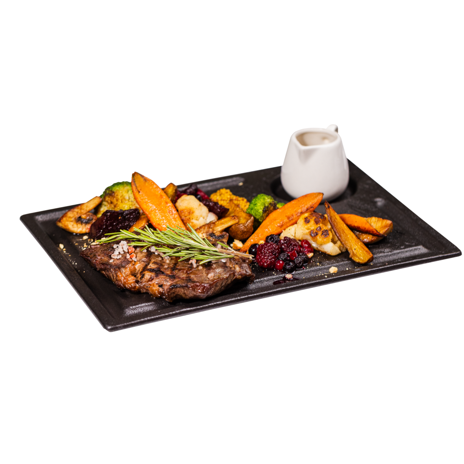 steak potatoes with rosemary, grilled vegetables, pickled forest fruits, pickled mustard seeds, green peppercorn sauce