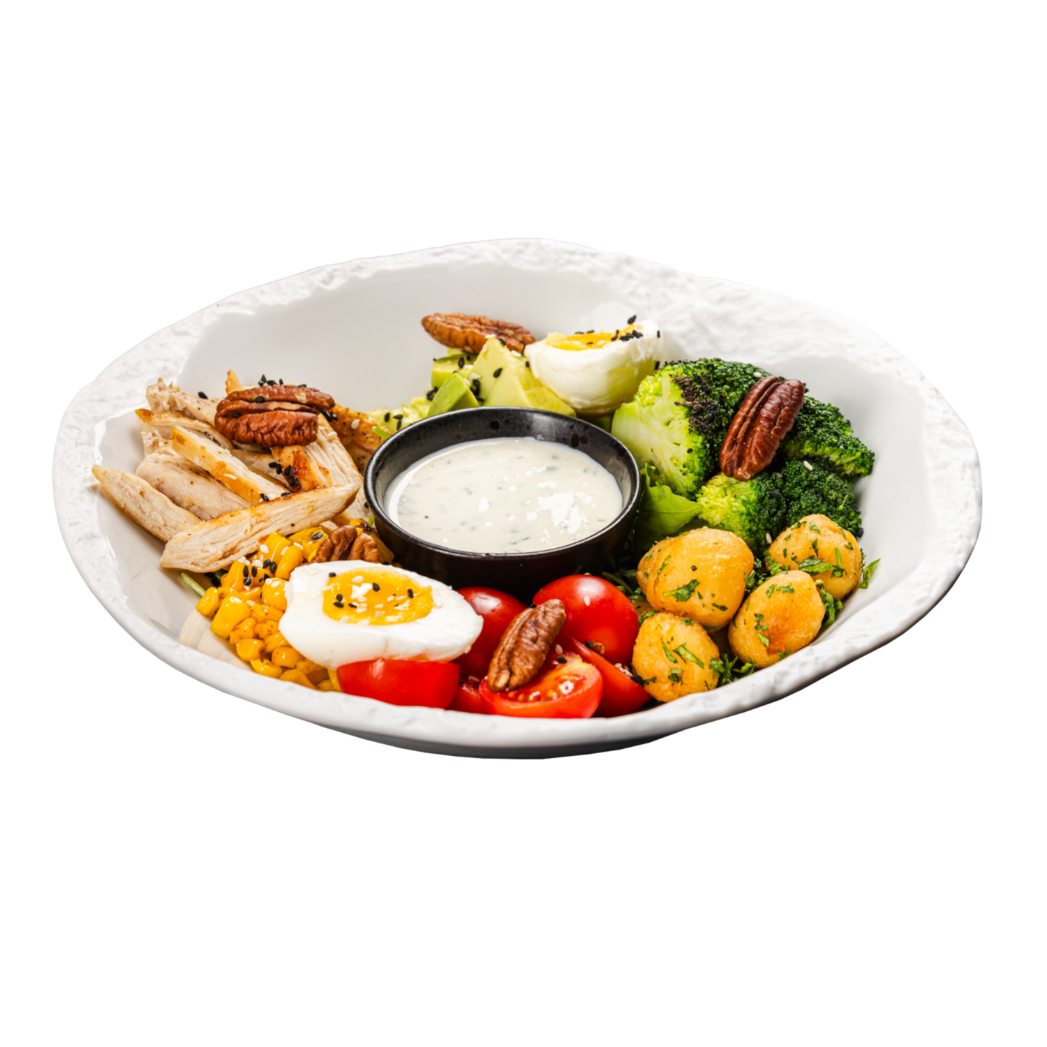 parisienne potatoes with herbs, steamed broccoli, confit cherry tomatoes, caper sauce